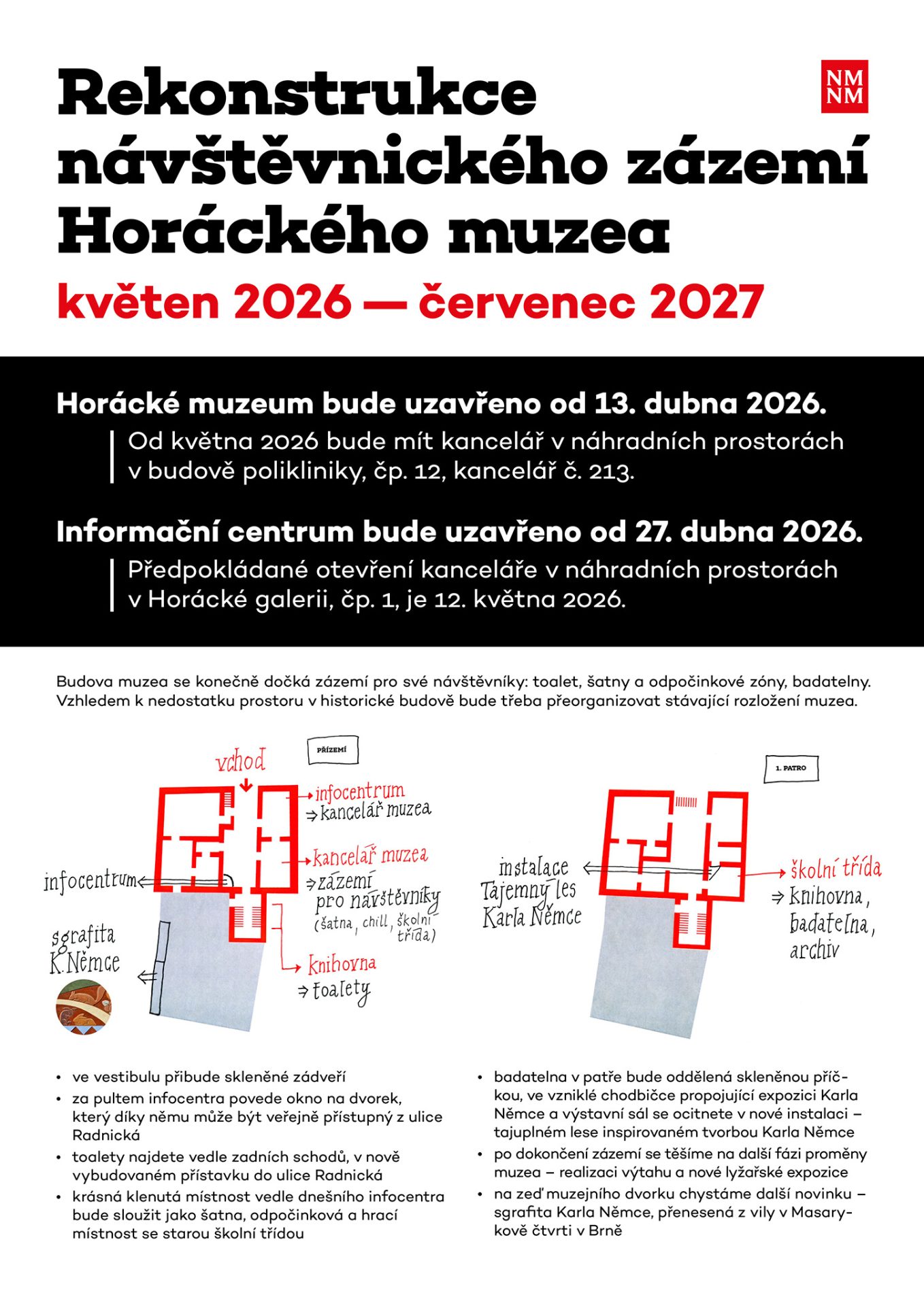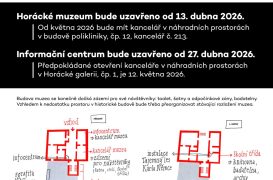 Horácké muzeum a Informační centrum NMNM čeká uzavření kvůli plánované přestavbě na rok. Muzeum se pro veřejnost uzavře již 13. dubna, Informační centrum pak ukončí svůj provoz o dva týdny později 27. dubna.