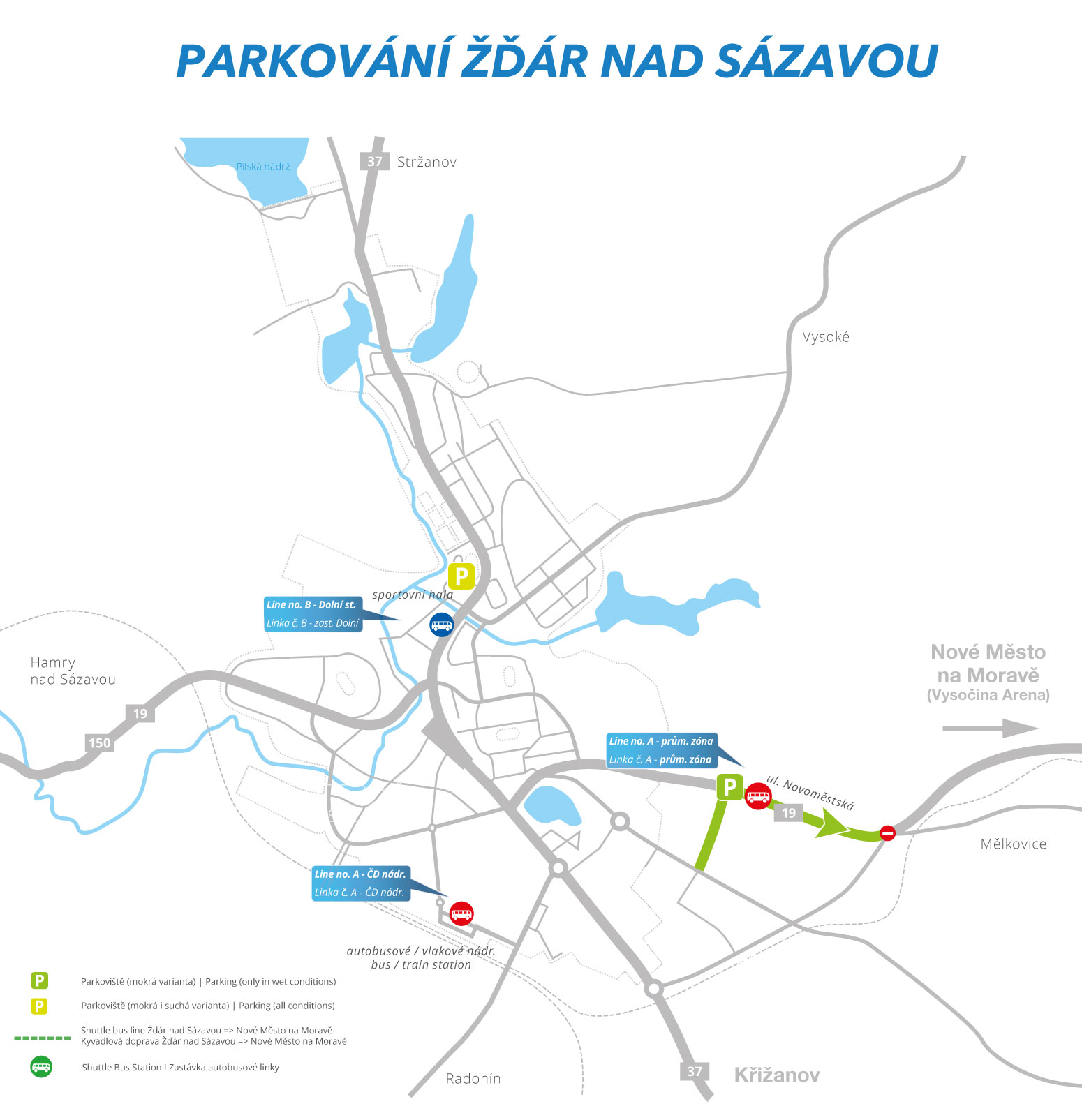 Ve Žďáru nad Sázavou mohou řidiči využít parkovací plochy u sportovní haly a rychlobruslařského areálu, odkud je zajištěn bezplatný odvoz autobusy do NMNM. V případě nepříznivého počasí bude umožněno parkování také na ulici Novoměstská.